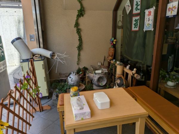 店内は飲食できませんので、外の飲食スペースに移動して待ちます。趣がありますね~。暑いのでは?と思われるかもしれませんが、強い冷風機があるので涼しいです♪