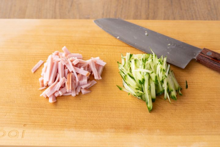 1、きゅうりは細切りにする。ハムは短冊切りにする。