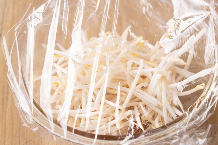 2、耐熱ボウルにAを入れて混ぜ、春雨、もやしを加えてレンジで600Wで3分加熱する。