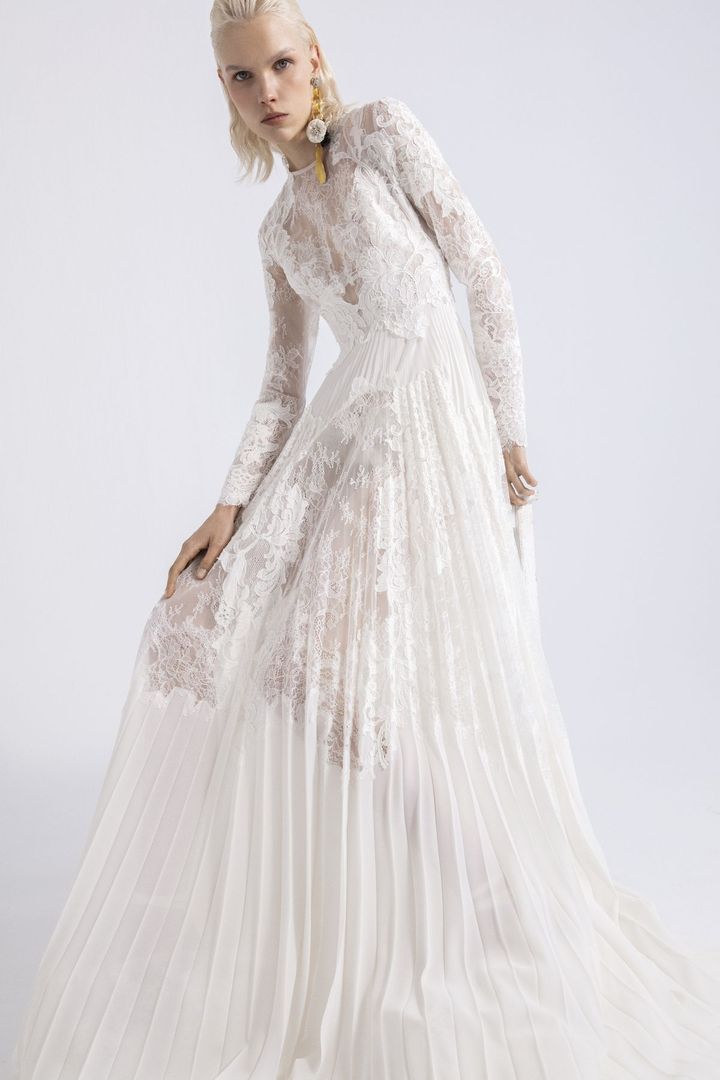 オーガンジーとシャンティイレースを組み合わせ、繊細な空気感を演出したドレス。アコーディオンプリーツのスカートが上品な中にトレンド感をプラスしています。ドレス レンタル料¥407,000(ミラー ミラー 丸の内 tel.03-5220-0291)