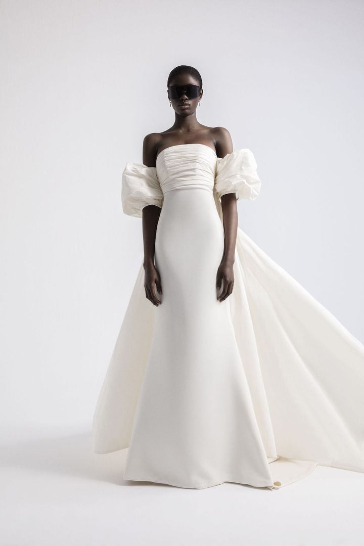 ヨーロッパの上質なファブリックを使用しているからこそ、シンプルながら存在感のあるドレススタイルが完成します。胸もとのシャーリング、ドロップショルダーのバルーンスリーブが上品なアクセントに。ドレス レンタル料¥374,000(ミラー ミラー 丸の内 tel.03-5220-0291)
