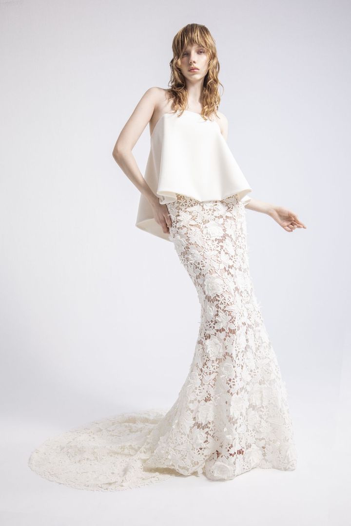 上半身はシンプルなベアトップスタイル、スカートにはクラフト感のあるレースを使用し、ドレスに新鮮な表情を演出。エレガントにも、モードにも着こなせそう! ドレス レンタル料¥407,000(ミラー ミラー 丸の内 tel.03-5220-0291)
