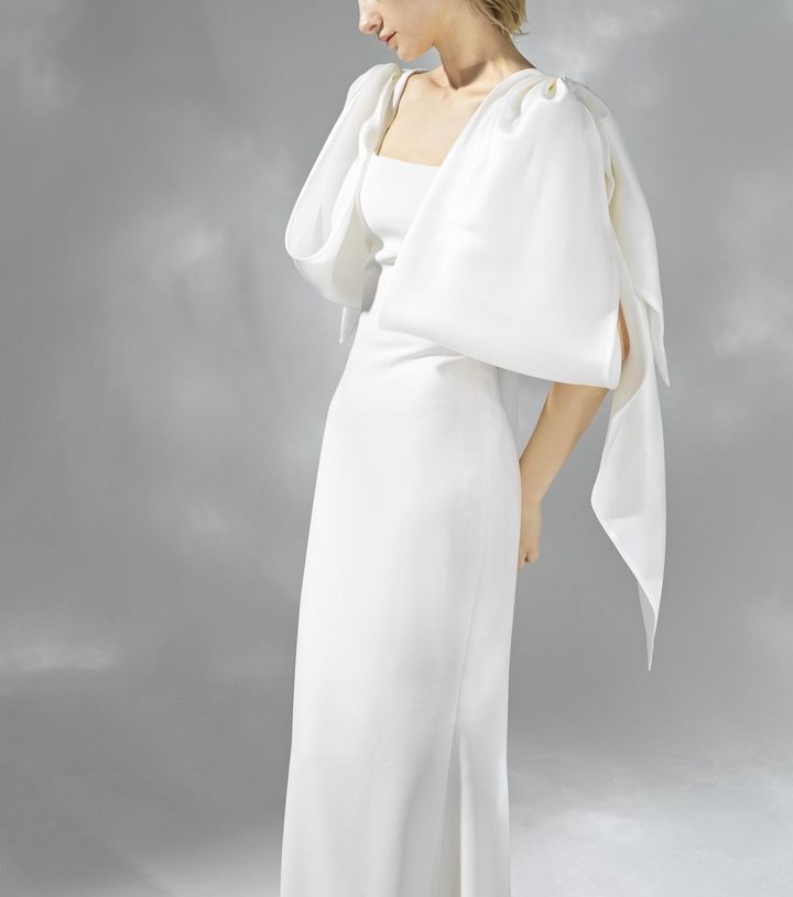 シンプルなスレンダーシルエットのドレス。両肩にビッグボウをあしらって。個性的なアクセントでありながら、二の腕をカバーする効果もあり! ドレス レンタル料¥352,000(プリマカーラ tel.03-5534-7880)
