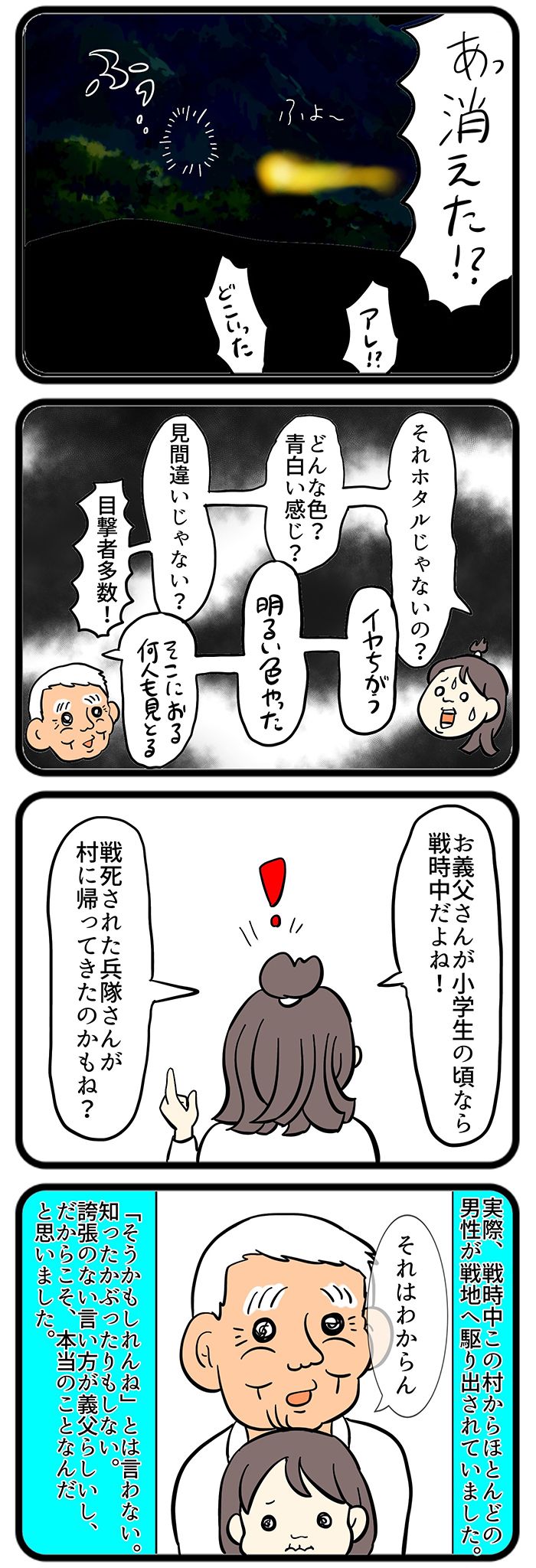 3. 義父・マキオさんが火の玉を見たのは太平洋戦争の真っ只中。兵隊さんが帰ってきたのかも、と私が言うとマキオさんは…【しぶしぶ同居したら義父が最高だった件・52】