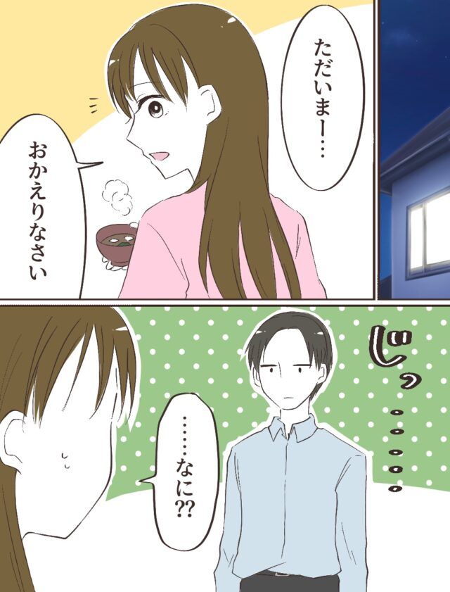 その夜帰宅すると、いつものようにカホさんが夕飯の支度をしていました。妻の様子を久しぶりにじっと見つめるキョウスケさんに、カホさんが落ち着かないのは言うまでもありません。