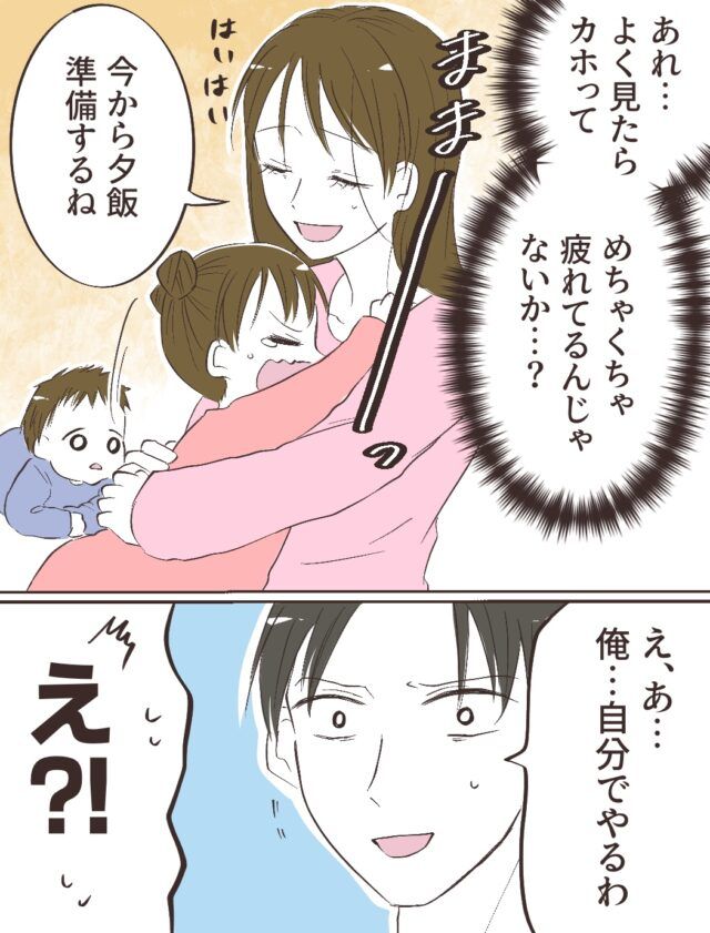 手のかかる幼児2人を相手しながら、「今から夕飯準備するね」と言うカホさんをよく見てキョウスケさんは気付きました。