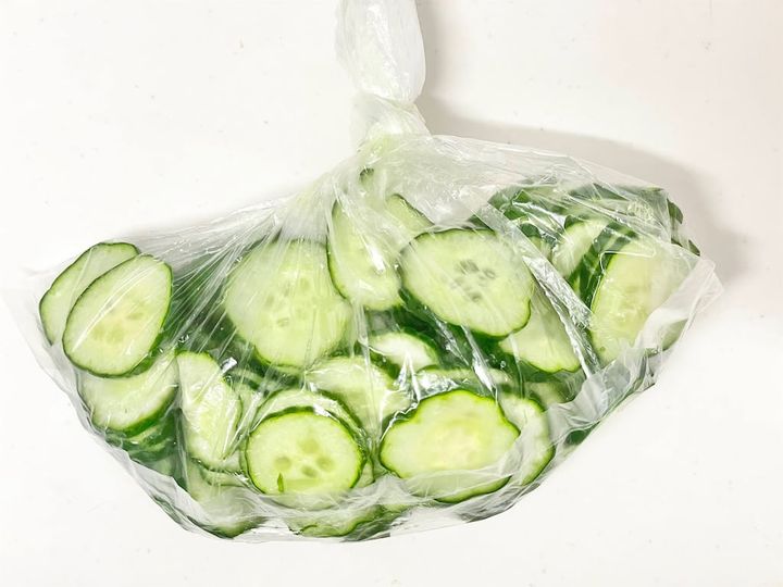 きゅうりは2~3mm幅に切り、ポリ袋に入れて塩を加えたら袋の上から揉み、空気を抜いて縛ります。
