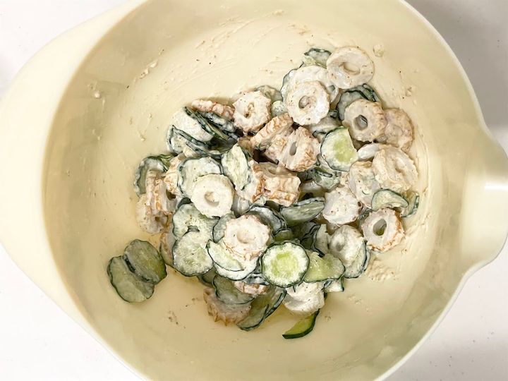 2. きゅうりとちくわを和えます。