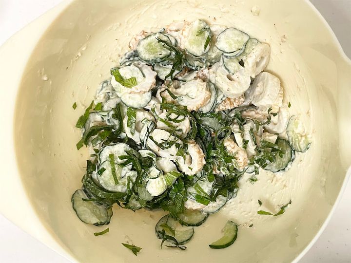 マヨネーズを使っているからこってりしているのをイメージしたんですが、青じそを加えたことでさっぱりとした後味に仕上がっています。
