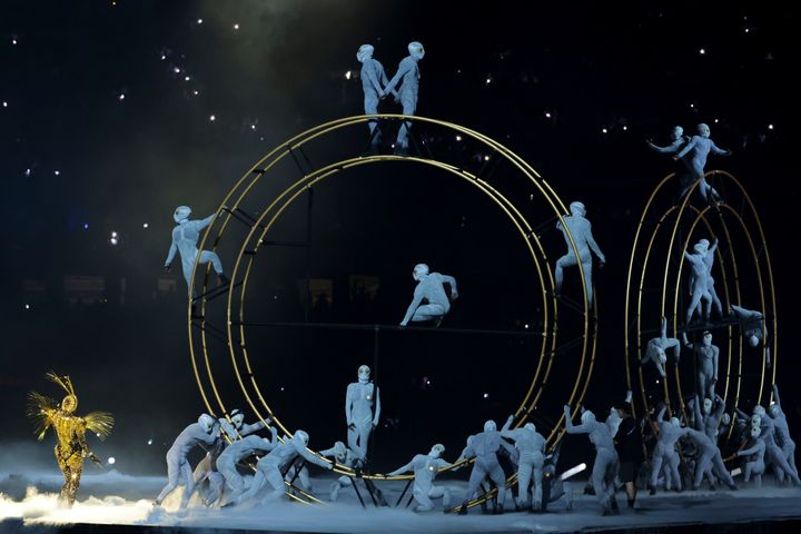 開会式にも登場したフードをかぶった奇妙な人物、ゴールデンボイジャーが空から降臨。ダンサーたちが神秘的なバレエを披露する中、地中に埋まっていたオリンピック・リングが現れ、空中に吊り上げらえる。その間、フランスのテノール歌手バンジャマン・ベルナイムが「アポロ讃歌」を歌い、垂直に吊るされたピアノをスイスの作曲家でピアニストのアラン・ロッシュが伴奏した。