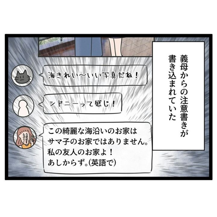 この漫画は、国際結婚をしたサマ子(@samako_aus)さんが義母とのSNS上でのやり取りに悩みながらも、自分なりにSNSの使い方を工夫し解決に向け努力するお話です。シドニーの海を背景に撮影した家族写真をSNSに投稿したサマ子さん。すると、義母から「このお家は、私の友人のお家よ!」と注意書きのコメントが書き込まれました。さすがのサマ子さんも、義母の無神経さにブチギレました。『義母のSNSが面倒くさい!』第11話をごらんください。