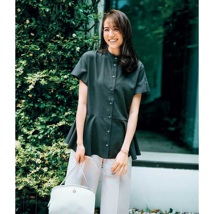 ペプラムブラウス¥17,600(エスエッセンシャルズ)パンツ¥17,930(アンクレイヴスタンダード/オンワード樫山)バングル¥42,900(モニス/フォーティーンショールーム)バッグ¥35,200(ダイアナ/ダイアナ銀座本店)