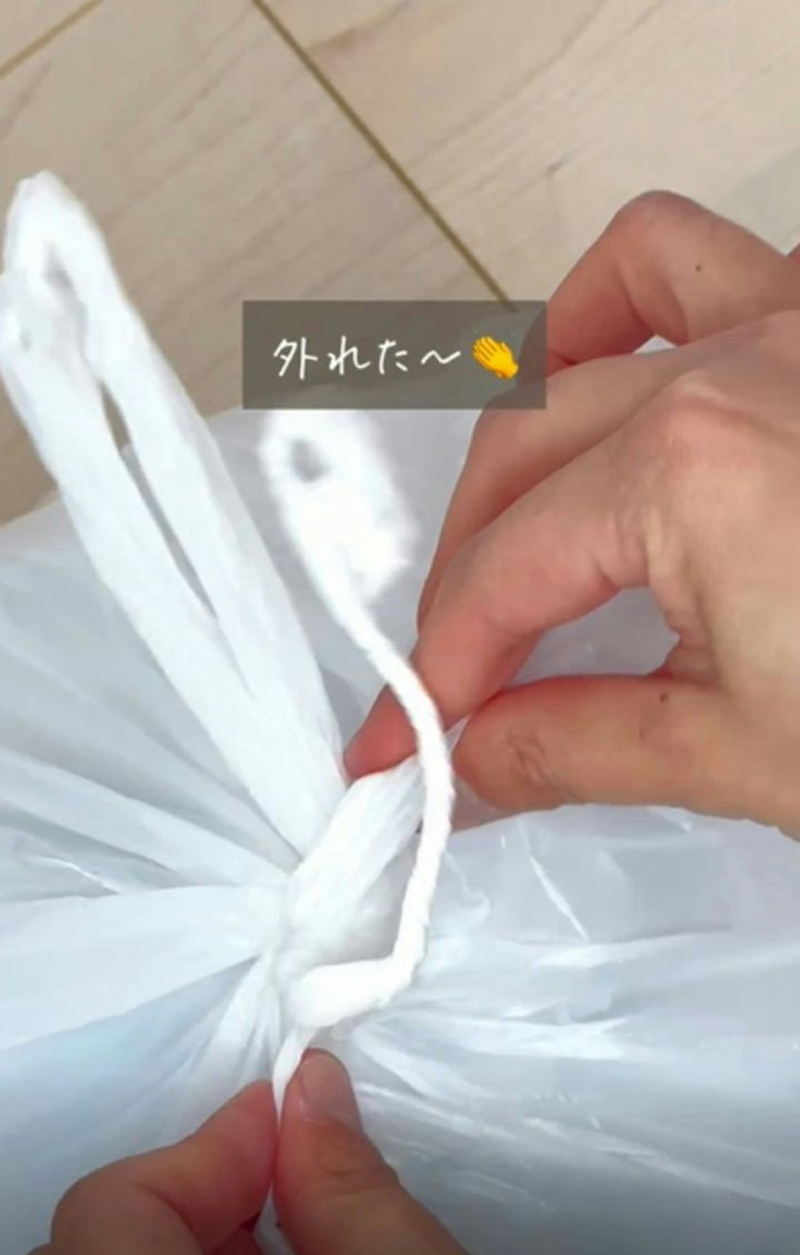 緩んだ結び目を押し込んでいくと、簡単に開封することができました。固く結んでしまった袋でも、簡単に解くことができるので、この裏技を使えばノーストレス!