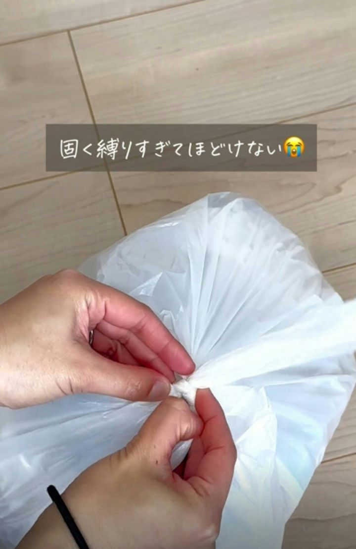 袋を再度開けようとしても、固く閉じた結び目はそう簡単には開けることができません。生ゴミを捨てることを諦めるか、新たにゴミ袋を使用して1枚無駄に使うか…究極の選択。