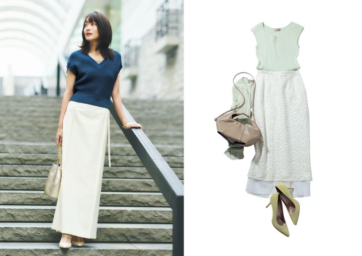 抜け感のある女らしさを作る、ベストとペンシルスカートのコンビ