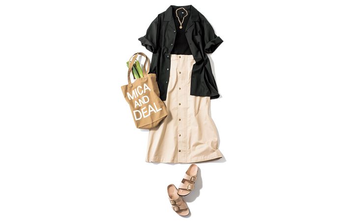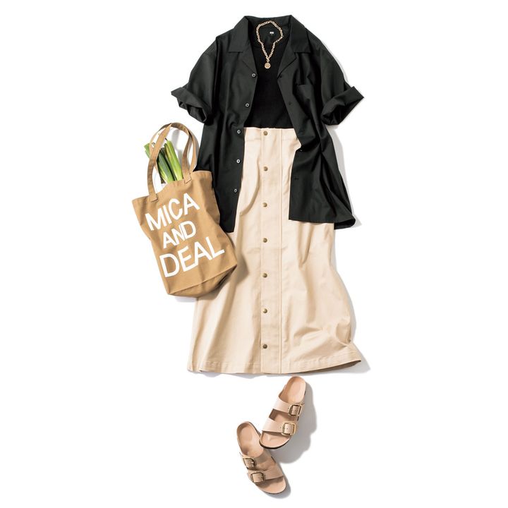 メンズっぽい開衿シャツは リラックス感のあるシルエットを。しわになりにくい 素材もうれしい。シャツ¥ 2,990(UNIQLO)