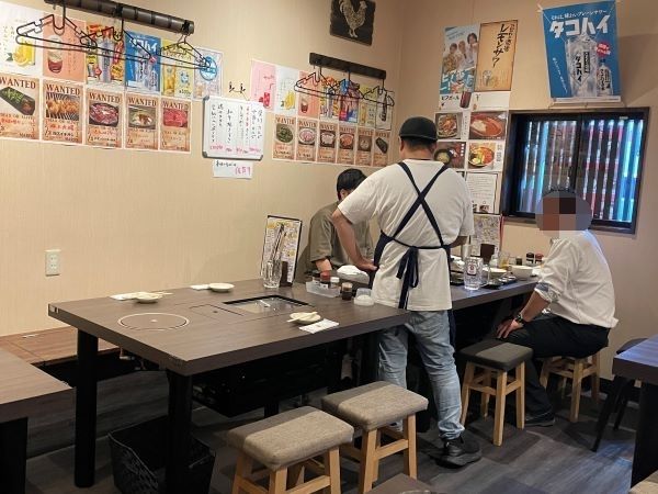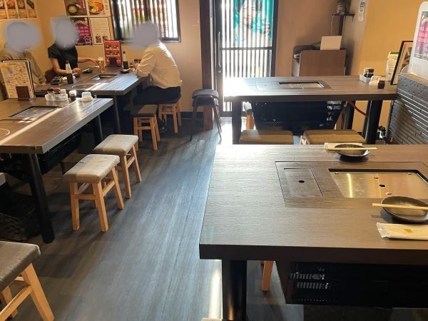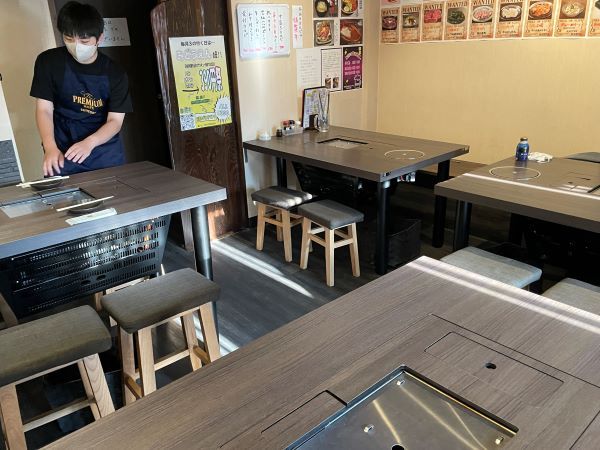 店内に入ると、シックな色合いの床、木目調の4~5人掛けのテーブル席が5卓。 明るすぎない照明なのに、白系の壁紙がいい感じです。 そして、何より焼肉店なのに天井に排気ダクトが一切なくスッキリしています。 大将のご自慢の無煙ロースターが、綺麗な壁、広々とした空間を作り出しています。