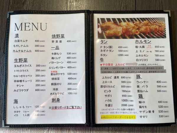 レギュラーメニューは、どれにしようか迷ってしまうほど豊富。 お肉はハーフオーダーが可能なので、色々な種類を楽しみたい方には良いシステムです。 メニュー右側に赤い文字で注意を引く一文あり。 ”平日限定 上カルビ〇〇円” とあります。 (あえて金額を隠しました。〇〇円の部分は是非、お店で確認してください!) ほっぺた親爺は、2人での訪問だったので「上限の2人前」を注文しました。平日で良かった!!