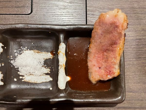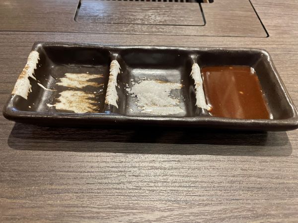 提供された味覚3兄弟。 酸っぱい(レモン汁)、しょっぱい(塩)、甘辛い(特製タレ)。