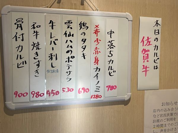 日替りボードには、骨付カルビ、レバー刺しなど焼肉屋さんのお約束メニューに加え、和牛焼きすき、雲仙ハムのポテサラなど、食いしん坊のハートにストライクです。