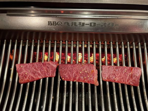 大将ご自慢の無煙ロースターで、焼き始めたところ。 白煙モクモクが無い ”視界良好” の中で食べる焼肉は、ビールと会話が進みました。