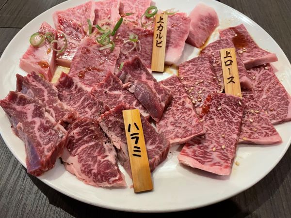 これが本日オーダーしたお肉です。 上ロースは霜降り具合が最高です。これでこの金額?とメニューを見直しちゃいました。 佐賀牛の上カルビも美しい!平日価格でここまで奉仕して良いの?と思ってしまうクオリティ。 ハラミはしっかりとした肉質で、重量感バッチリ。 さぁ~ビール飲みながら食べるぞ!