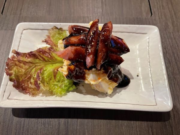 レギュラーメニューで赤文字で自家製をアピールした ”雲仙ポテサラ”。 さらに壁面の日替りメニューにも掲示され、大将一押しに違いないと思いオーダー。 結果、間違いない自信作でした。 ポテサラの上に、特製タレを絡めた雲仙ハムが載っていて、満足感MAX。