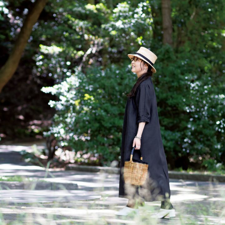 「1枚で着られるワンピースは楽ですが、カジュアルすぎるとだらしない印象になったり、貧相に見えてしまうことも。きちんと見える黒で、首元が見えない衿付きのデザインを選ぶようにしています。汗で足に靴がはりつくのも心地よくないので、必ず靴下を履くようにしています」