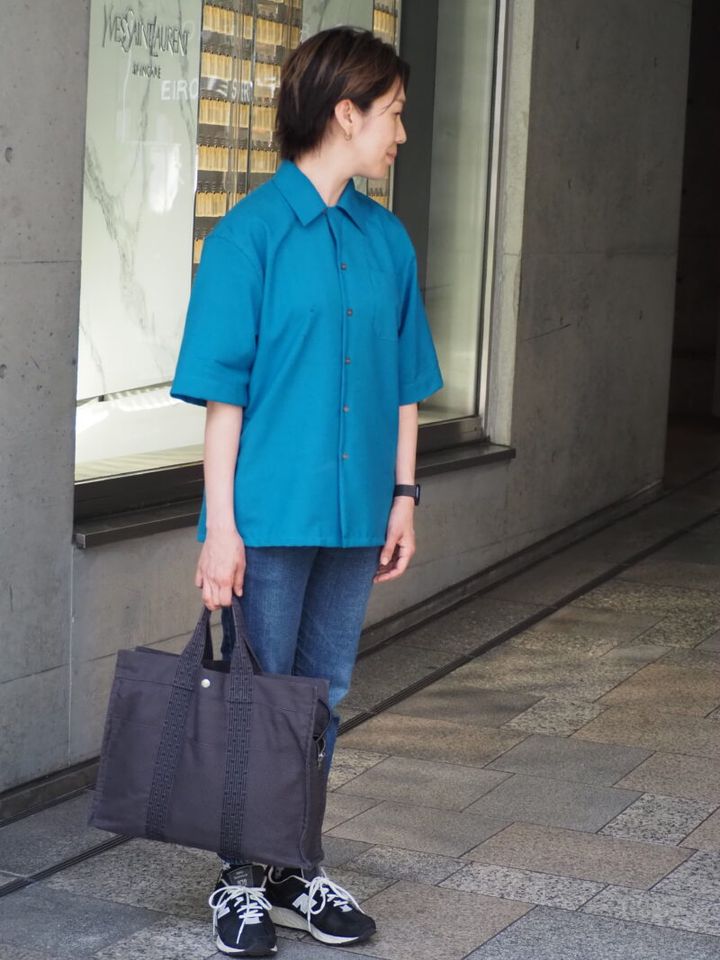 仕立ての良さが感じられ、目を引く派手色カラーでも大人の雰囲気をまとうシャツは「マルニ」。背中についたタグもとってもおしゃれなアイテムです。「旦那さんと私が、体形や身長がほぼ同じなのでアイテムをシェアすることが多くて。この『マルニ』のシャツもそのひとつです。最近は全身スタイルが“丸く”見えないように色々と苦心しているのですが、メンズアイテムはそういった意味でも便利。直線的なシルエットが多いので、キリッとした印象になります」。さらにジーパン、ニューバランスとカジュアルなトーンが強いため、長年愛用しているという「エルメス」のバッグが調整役に。爽やかさと格好良さ、そして大人の女性らしい気品を感じる夏のコーディネートの完成です。