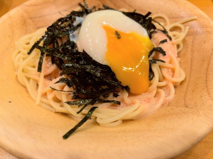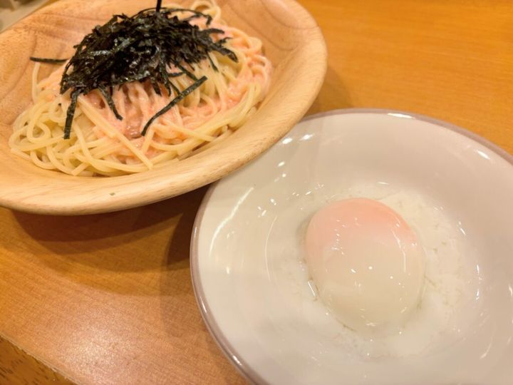 パスタメニューの中でも人気が高く、我が家もよく注文している「タラコソースシシリー風(400円)」。いつもの味も大好きなのですが、より美味しいアレンジを求めて「トッピング半熟卵(50円)」を追加してみることに。