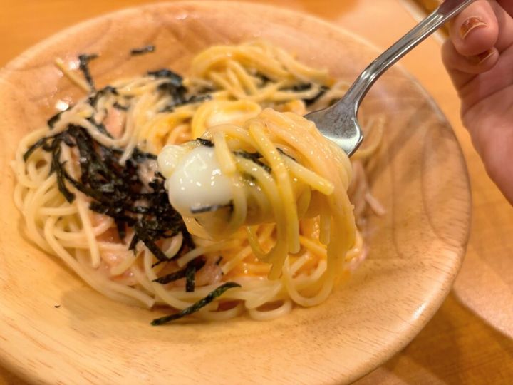 卵と明太子がしっかり絡み合うように混ぜ合わせ、いざ実食! もともと「タラコソースシシリー風」は、タラコと生クリームの甘みが詰まったマイルドな一品なのですが、卵を絡めることによってよりまろやかでクリーミーな味わいに。半熟卵ひとつでここまで味わいが変わるものかと驚きました。