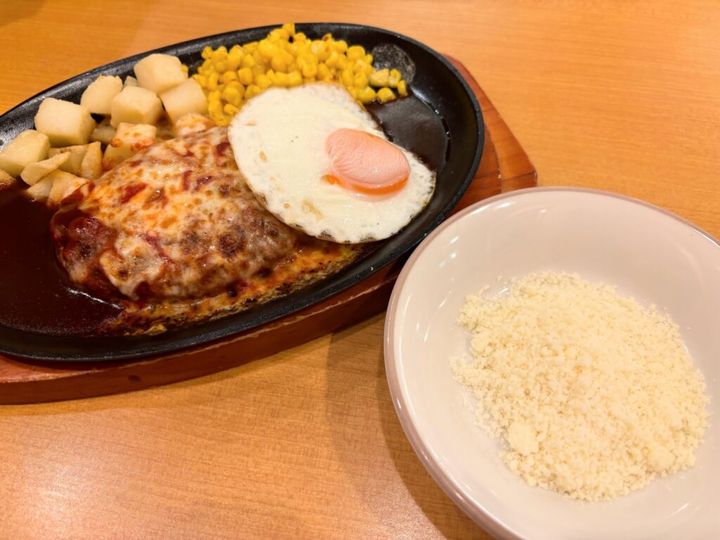 お次は「トッピング粉チーズ(グランモラビア)(100円)」を使った裏技アレンジ。甘みのあるハードチーズを粉状にした人気のトッピングです。この粉チーズを、すでにチーズがたっぷりとかかった「イタリアンハンバーグ(500円)」にかけてみることに!