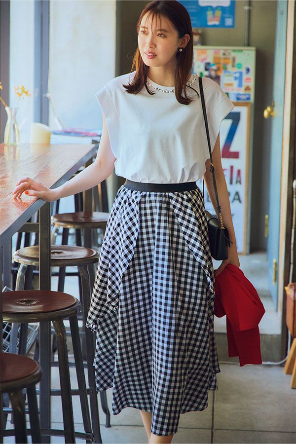 大人可愛いギンガムコーデを首元のビジューでリッチに格上げ