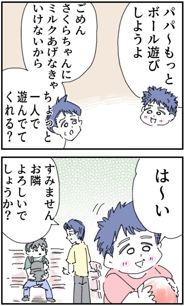 「パパ~、もっとボール遊びしようよ!」「ごめん。さくらちゃんにミルクあげなきゃいけないから、ちょっと一人で遊んでてくれる?」そう言われたたくちゃんは「は~い」と素直に返事をしました。すると「すみません、お隣よろしいでしょうか?」たくちゃんのパパがいちろうさんに声を掛けます。