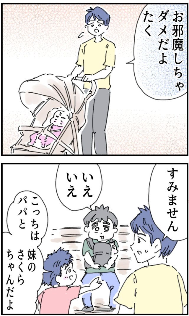 「お邪魔しちゃダメだよ。たく」そう言ってやって来たのはベビーカーを押した男性でした。「すみません」といちろうさんに謝る男性に「いえいえ」と答えると、「こっちはパパと妹のさくらちゃんだよ」とたくちゃんが教えてくれました。
