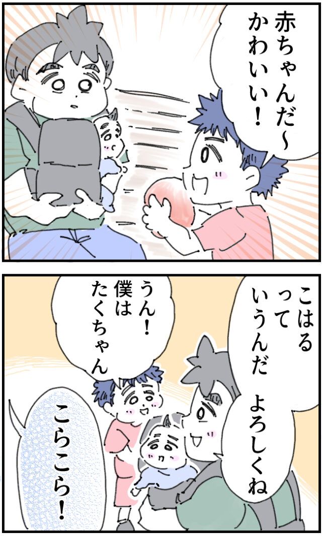 公園でベンチに座っていたこはるちゃんといちろうさん、そこにボールが転がって来て、見ていると向こうから走って来る男の子の姿が!すると「すみませ~ん!あっ!」と走って来た男の子が「赤ちゃんだ~!かわいい!」とこはるちゃんを見ていいました。「こはるって言うんだ。よろしくね」いちろうさんが男の子にそう言うと「うん!僕はたくちゃん!」そう答える男の子に「こらこら!」後ろからやって来た人が声をかけました。