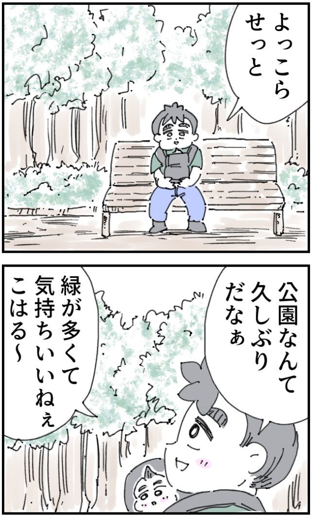 そしてかおりさんを見送ってからベンチに座ったいちろうさん、「よっこらせっと・・公園なんて久しぶりだなぁ。緑が多くて気持ちいいねぇ、こはる~」とこはるちゃんに話しかけます。