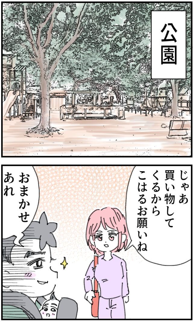 すれ違った女性に「イクメン」だと褒められてご満悦のいちろうさん、ドヤ顔で「そろそろ参りますか」とかおりさんに話しかけ、腹を立てながらも、家族3人で公園に到着しました。「じゃあ、買い物してくるからこはるお願いね」と言うかおりさんに「おまかせあれ」イクメンと言われて上機嫌のいちろうさんは自信満々で答えました。