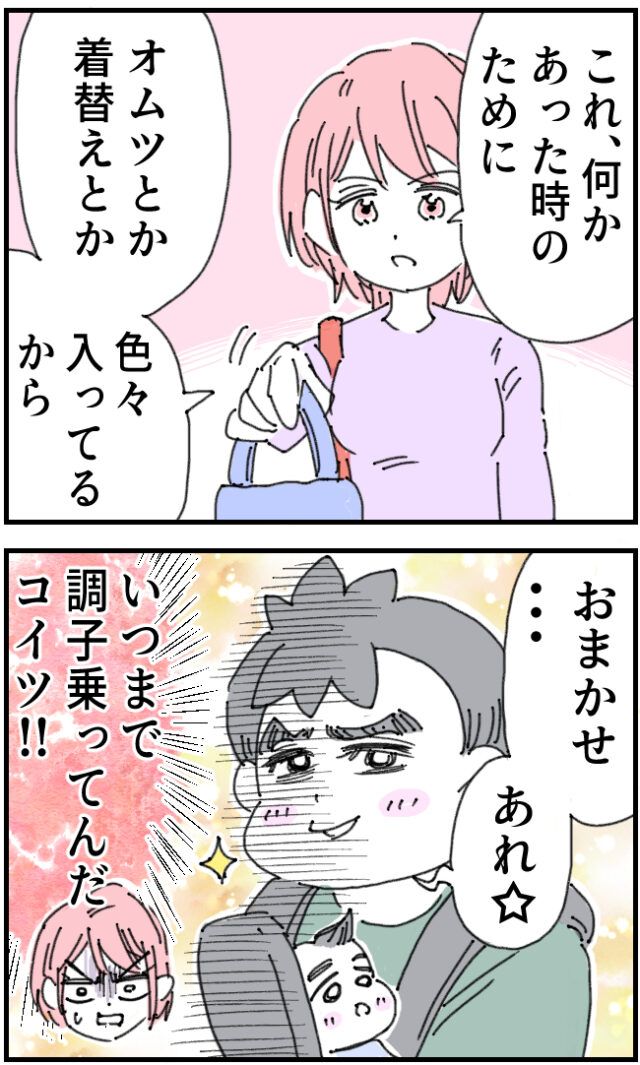 すると「これ、何かあった時のために、オムツとか着替えとかいろいろ入ってるから」とかおりさんがバッグを差し出し、それを受け取るいちろうさんは「おまかせ・・あれ!」とまだ調子に乗ったまま(汗)かおりさんは「いつまで調子乗ってんだコイツ!!」と心の中でボヤきました。