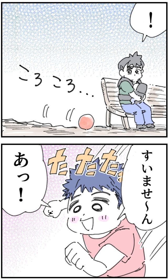 すると、向こうからコロコロ・・とボールが転がってきました。「!」それに気づいたいちろうさんが見ていると、「すいませ~ん!あっ!」少年が走ってこちらに来るのが見えました。