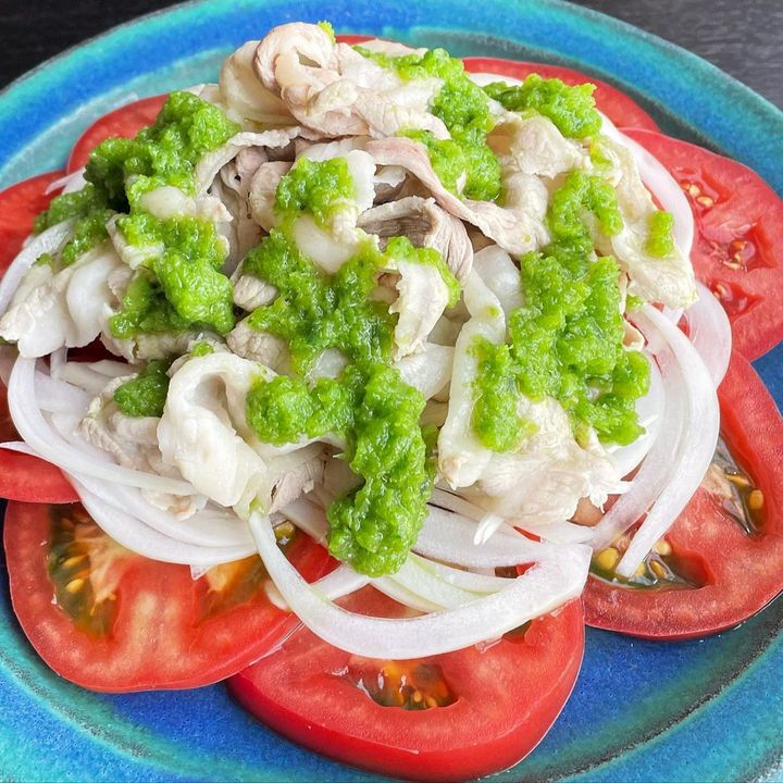 トマトの酸味、玉ねぎの辛味、豚肉の旨味、そしてゴーヤの苦味。絶妙な組み合わせが斬新でおいしい、暑い日でもさっぱり食べられる一品です。