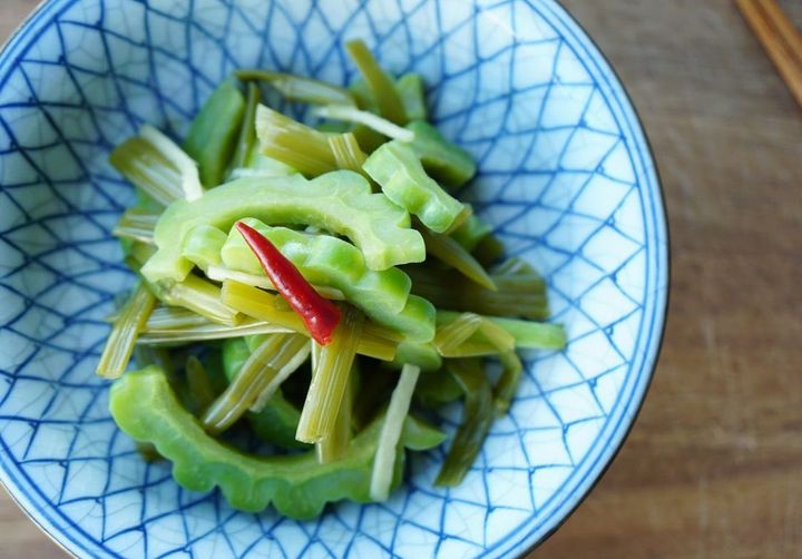 シャキシャキとした食感とほろ苦さがたまらない、空芯菜とゴーヤの漬物。