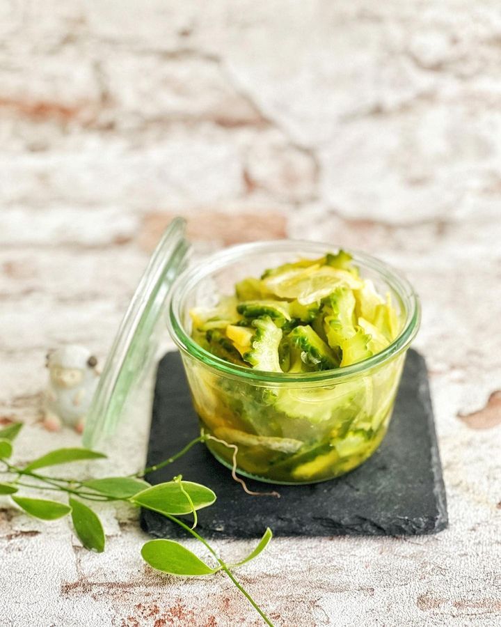 ゴーヤのワタをとって、塩ときび糖で揉んでちょっと置いてから、はちみつとレモンを合わせたものと合わせて漬けおくだけ。Instagram(@sinar.yoshi)