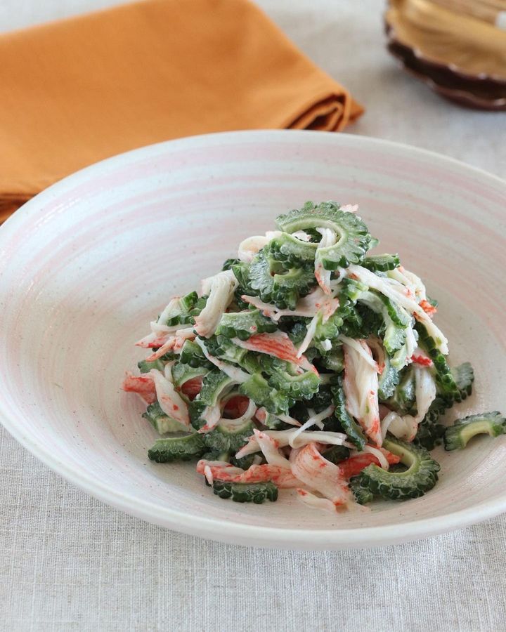 薄切りにして塩を振り、水気を絞ったゴーヤにカニカマを合わせ、調味料で和えたらできあがり。