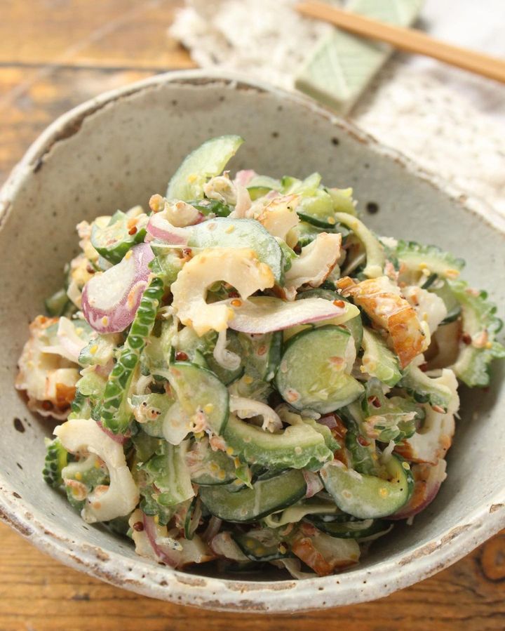 塩もみして苦味を抑えたゴーヤにきゅうりと紫玉ねぎの薄切り、旨味たっぷりのちくわとちりめんじゃこを合わせて。