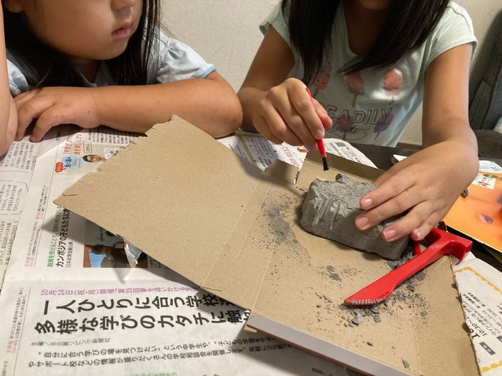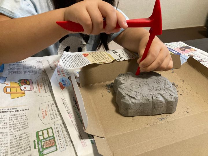 次女が頑張って発掘しているのをみて、4年生の長女もやってみたい~と参戦。ノミとハンマーをどう使うと上手に化石ブロックが割れるか、2人で考えながら発掘していました!すべて発掘するのになかなかの時間がかかりましたが、飽きることなく頑張っていました。