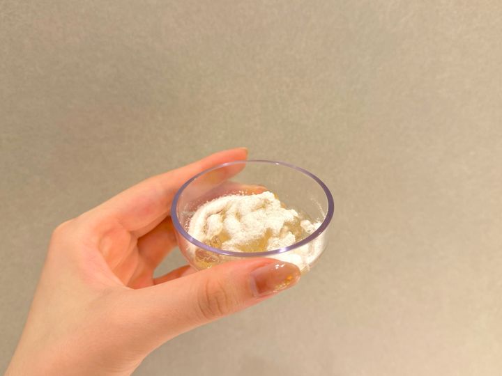⒈専用カップにジェル1包と顆粒パウダーを入れ、スパチュラでさっくりと混ぜ合わせる