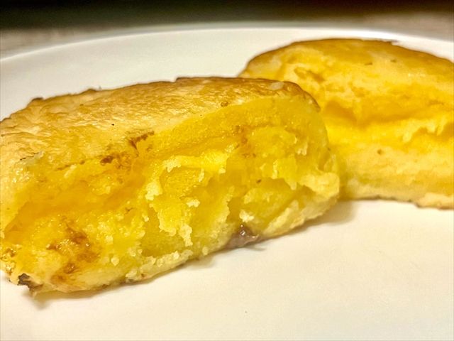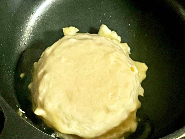 天ぷら液(小麦粉、卵、水)につけて、揚げ焼きにします。両面がキツネ色になったら完成です。