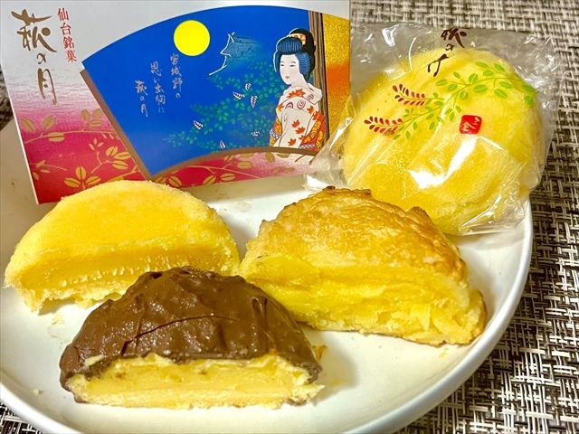 衣は表面はサクッと、中はモチっとしていて、ふわふわの萩の月との相性も抜群。一口で3種類の食感を味わうことができるんです。カスタードクリームは少しとろっとしていて、噛んだ瞬間あふれ出てきます。少し今川焼に似たようなお味です。