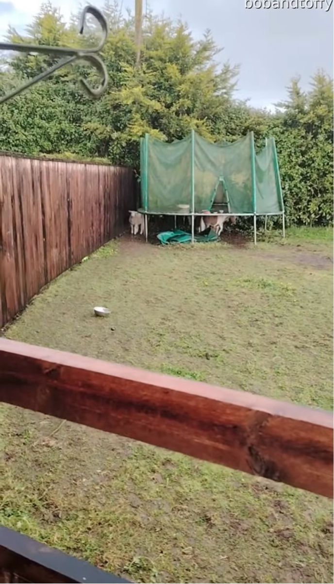 撮影者さんは、放牧していたヒツジやポニーたちのもとへ向かうと「戻っておいで!」と声をかけて呼び戻そうとしています。 よく見ると、みんなでトランポリンの下に潜り込んで雨宿りしているようです。